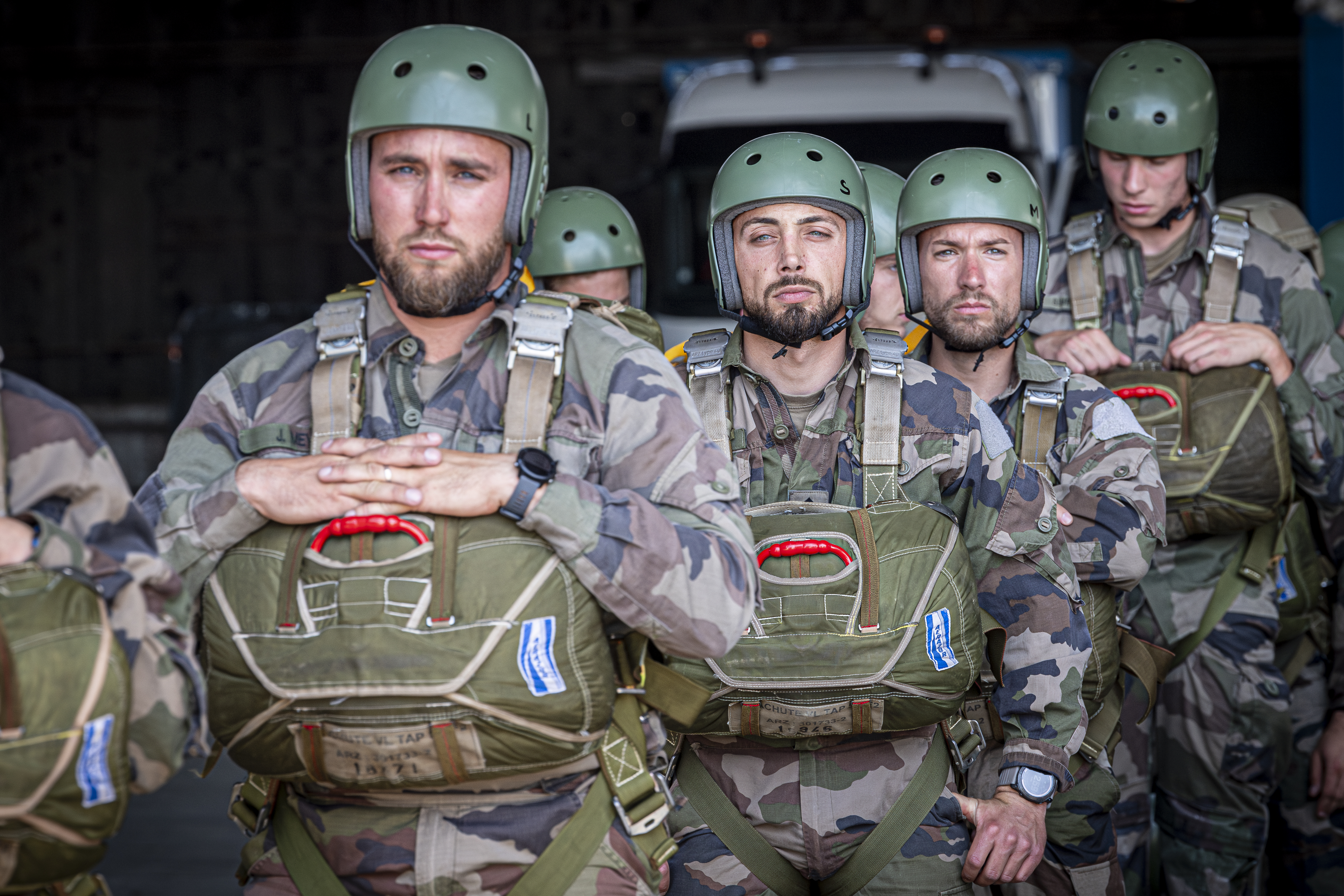 Explication : Des personnels de l'armée de l'air et de l'espace ont fait des sauts en parachute avec un casa le 05 juin 2024 sur la base aérienne 701 de Salon de Provence