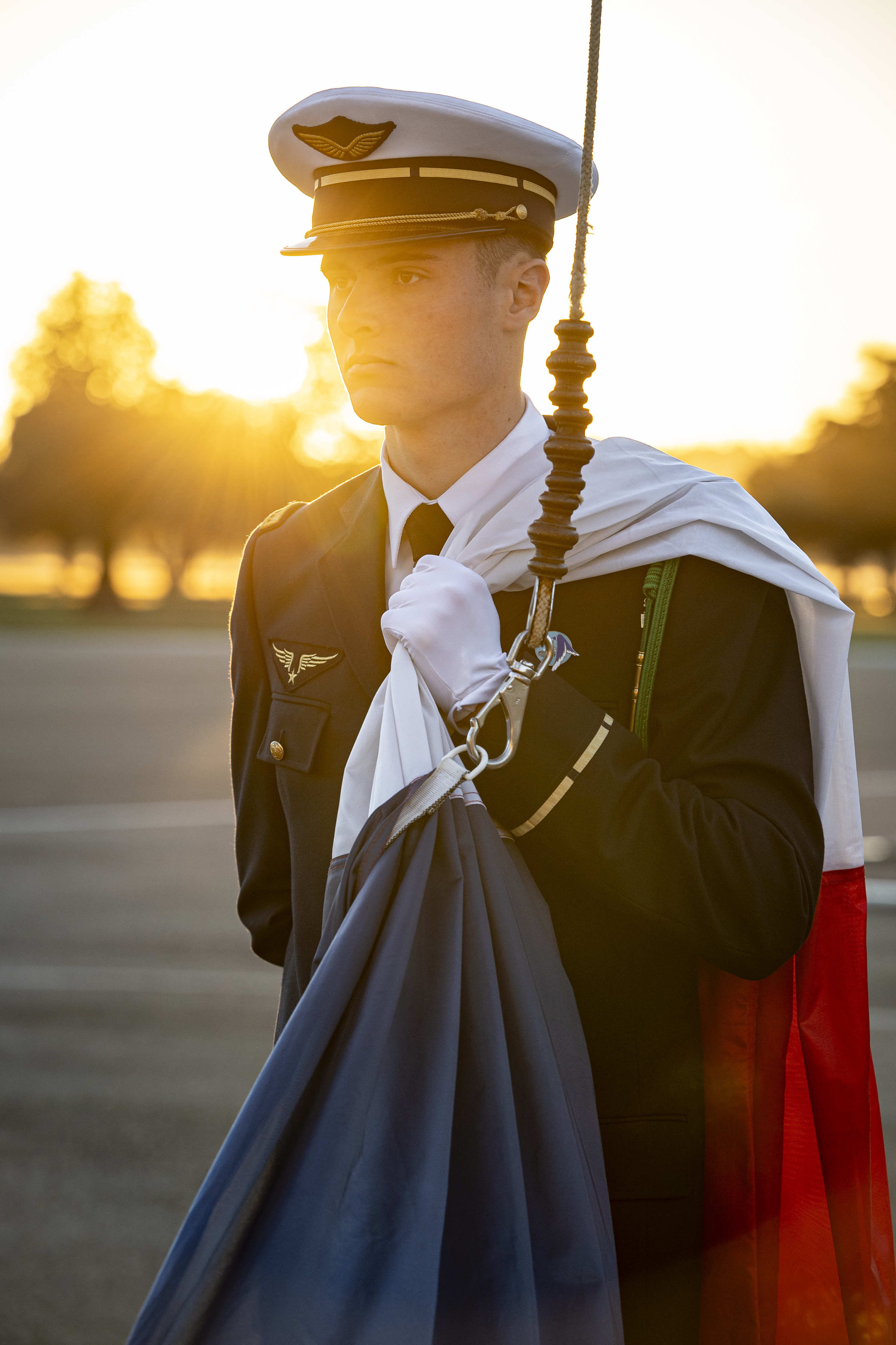 Explication : La cérémonie des couleurs est un rituel mensuel au sein de l’Armée de l'Air et de l'Espace, auquel le personnel de l’école comme de la base aérienne ne manque pas. Au fil des années, les différentes promotions d’élèves-officiers se sont mesurées à cet exercice qui demande rigueur et précision. C’est un moment solennel durant lequel ils honorent ceux qui sont tombés au champ d'honneur, ceux qui ont servi avec bravoure et dévouement, et ceux qui continuent de porter fièrement nos couleurs aujourd'hui. Le drapeau, flottant dans le ciel salonais, représente le lien qui relie ces futurs officiers à leurs anciens. L’étendard français est aussi un symbole vivant de la cohésion et de l’engagement des Aviateurs pour défendre la nation.