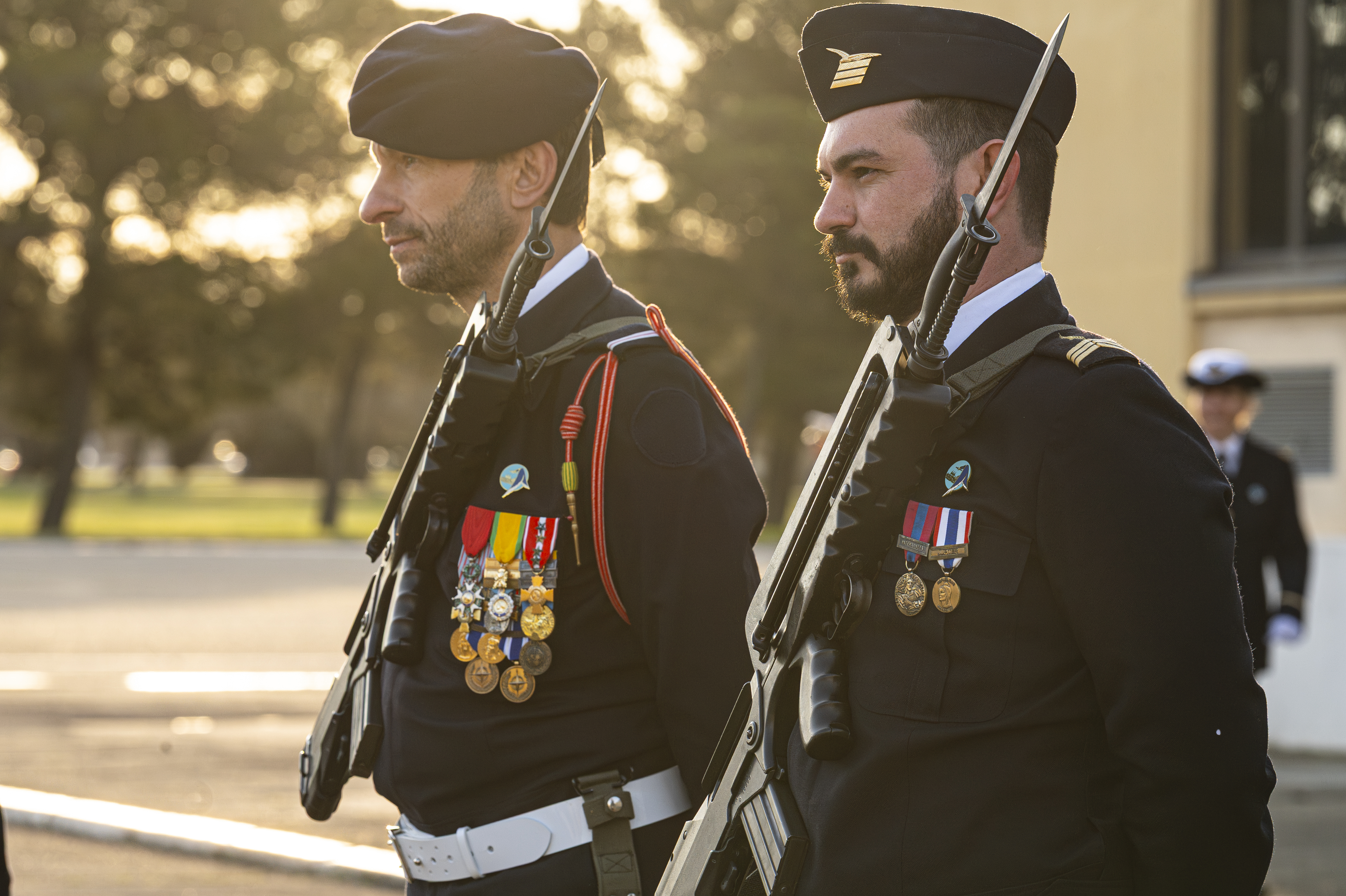 Explication : Lors de la cérémonie mensuelle des couleurs, différents cadres de la base aérienne ou de l'École ont l'occasion de faire partie du piquet d'honneur.