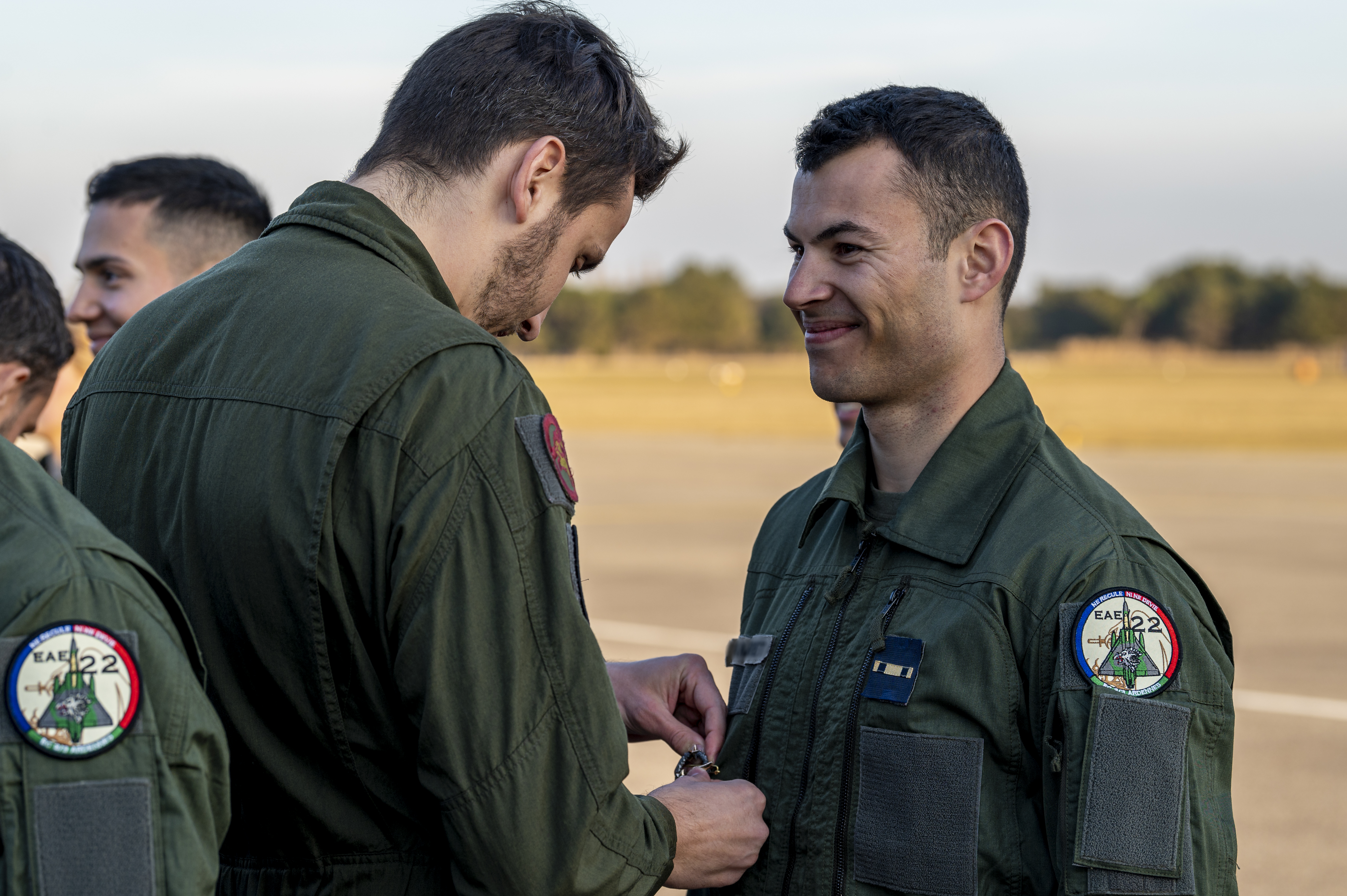 Explication : Chaque année, un escadron parraine une promotion de l'École. Au cours de la cérémonie, les élèves personnels navigants reçoivent leur demi-aile, tandis que l'ensemble se voit remettre la pucelle de l'Escadron parrain.