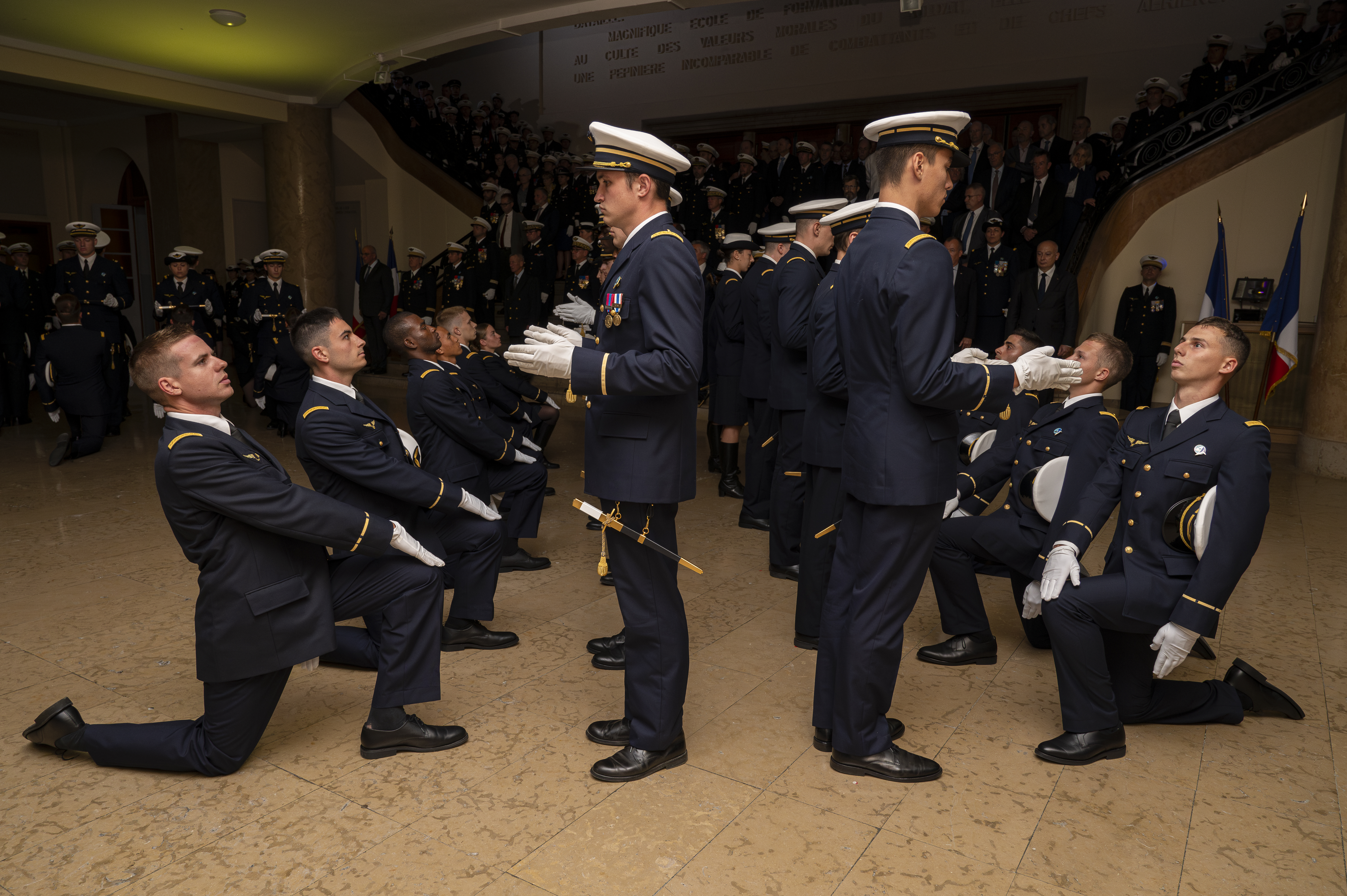 Explication : La cérémonie de remise des poignards, emblématique de l’École, confirme l’entrée dans le corps des officiers de l’armée de l’Air et de l’Espace. Symbole de commandement, le poignard est un marqueur fort de l’engagement que ces élèves-officiers prennent dans le cadre de leur carrière.