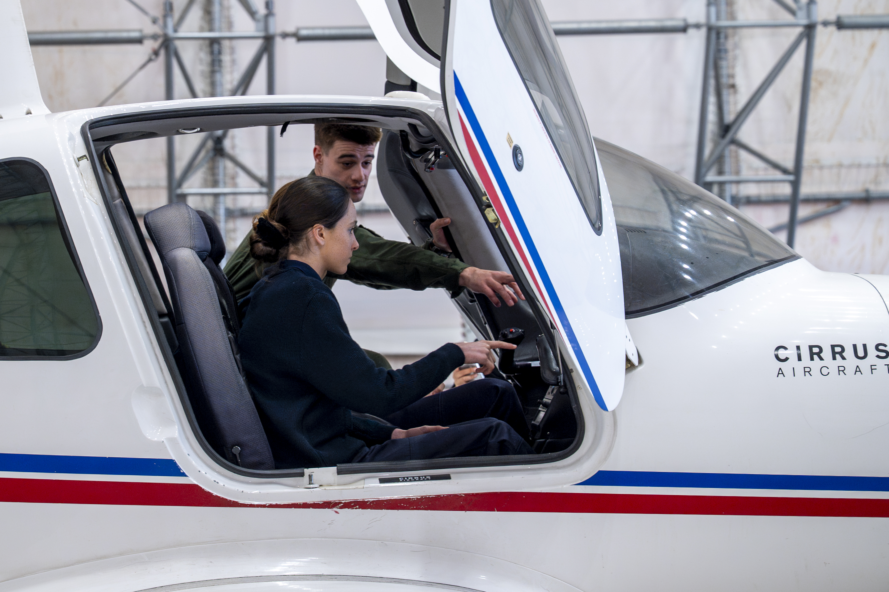 Explication : Les élèves-officiers issus du personnel navigant (EOPN) accueillent ici la classe défense du 3ᵉ Régiment d'artillerie de marine, pour une visite du Centre de formation aéronautique militaire initiale (CFAMI).