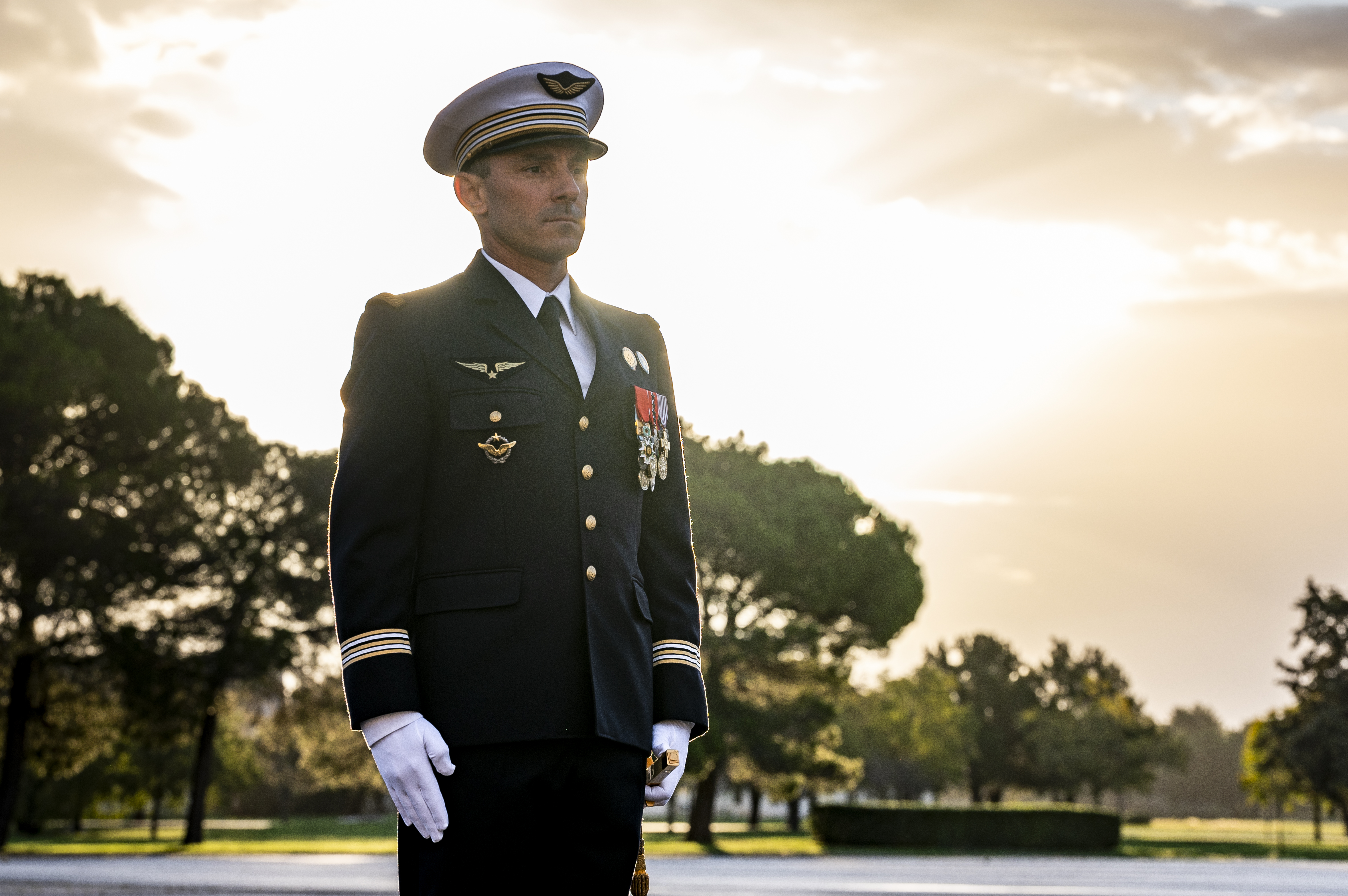 Explication : La cérémonie des couleurs est un rituel mensuel au sein de l’Armée de l'Air et de l'Espace, auquel le personnel de l’école comme de la base aérienne ne manque pas. Au fil des années, les différentes promotions d’élèves-officiers se sont mesurées à cet exercice qui demande rigueur et précision. C’est un moment solennel durant lequel ils honorent ceux qui sont tombés au champ d'honneur, ceux qui ont servi avec bravoure et dévouement, et ceux qui continuent de porter fièrement nos couleurs aujourd'hui. Le drapeau, flottant dans le ciel salonais, représente le lien qui relie ces futurs officiers à leurs anciens. L’étendard français est aussi un symbole vivant de la cohésion et de l’engagement des Aviateurs pour défendre la nation.