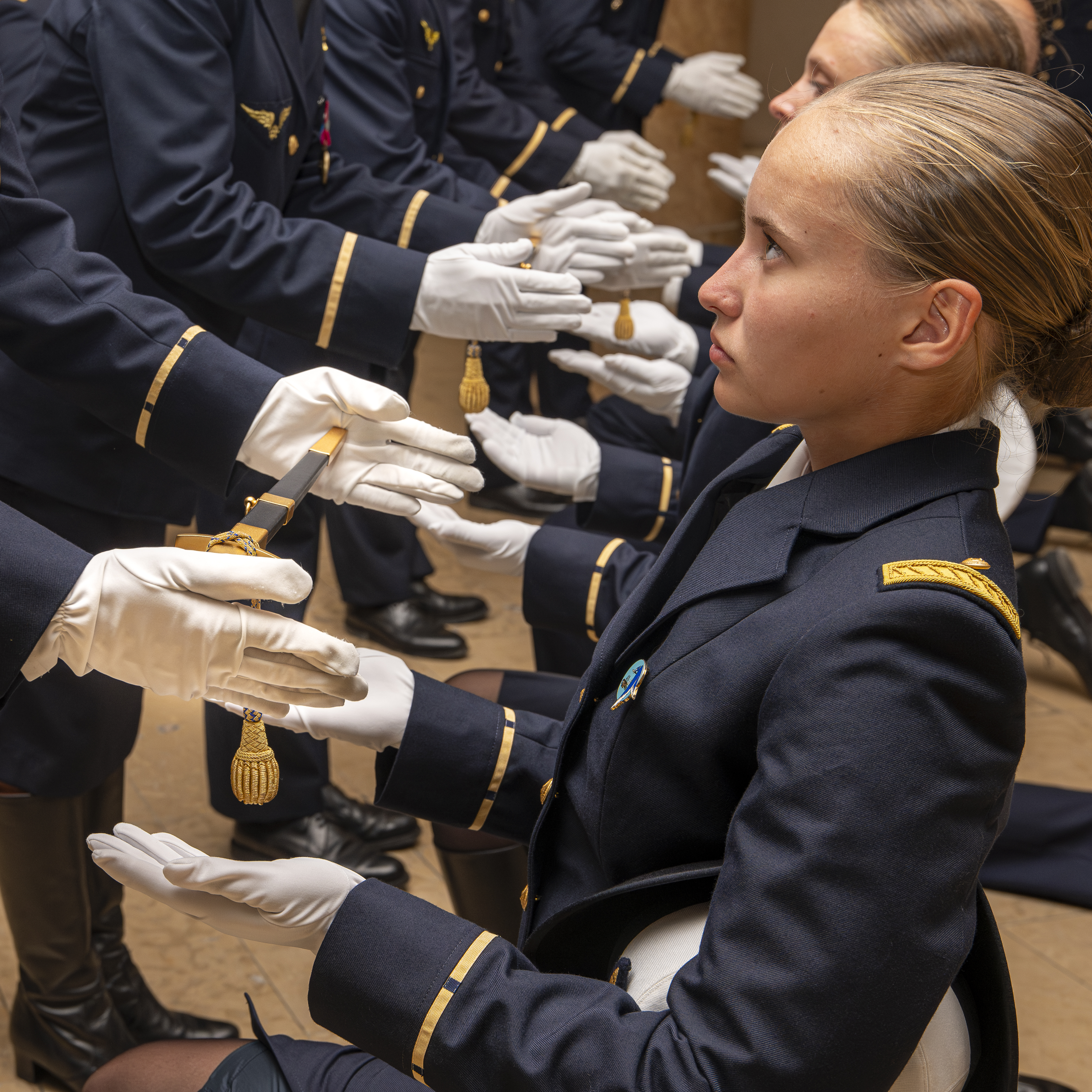 Explication : La cérémonie des poignards, un moment symbolique et solennel, marque le passage des élèves officiers de l'Armée de l'Air à leur statut d'officiers pleinement intégrés dans la force aérienne. Cette tradition, qui se déroule généralement à la fin de leur formation à l'École de l'air et de l'espace, voit chaque futur officier recevoir un poignard des mains d'un supérieur.