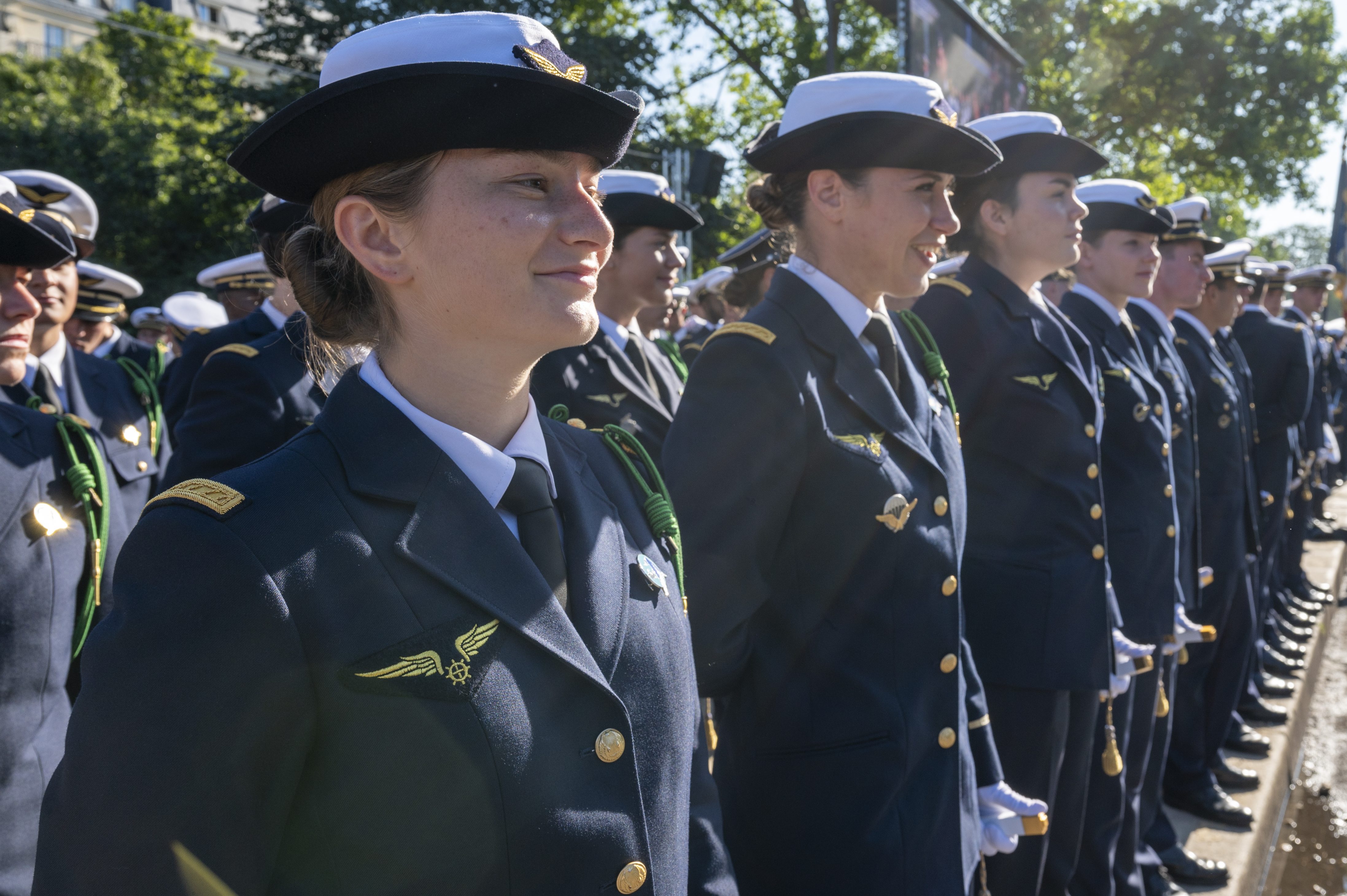 Explication : La promotion 2023 de l'École de l'air et de l'espace présente à Paris lors du traditionnel défilé du 14 Juillet.