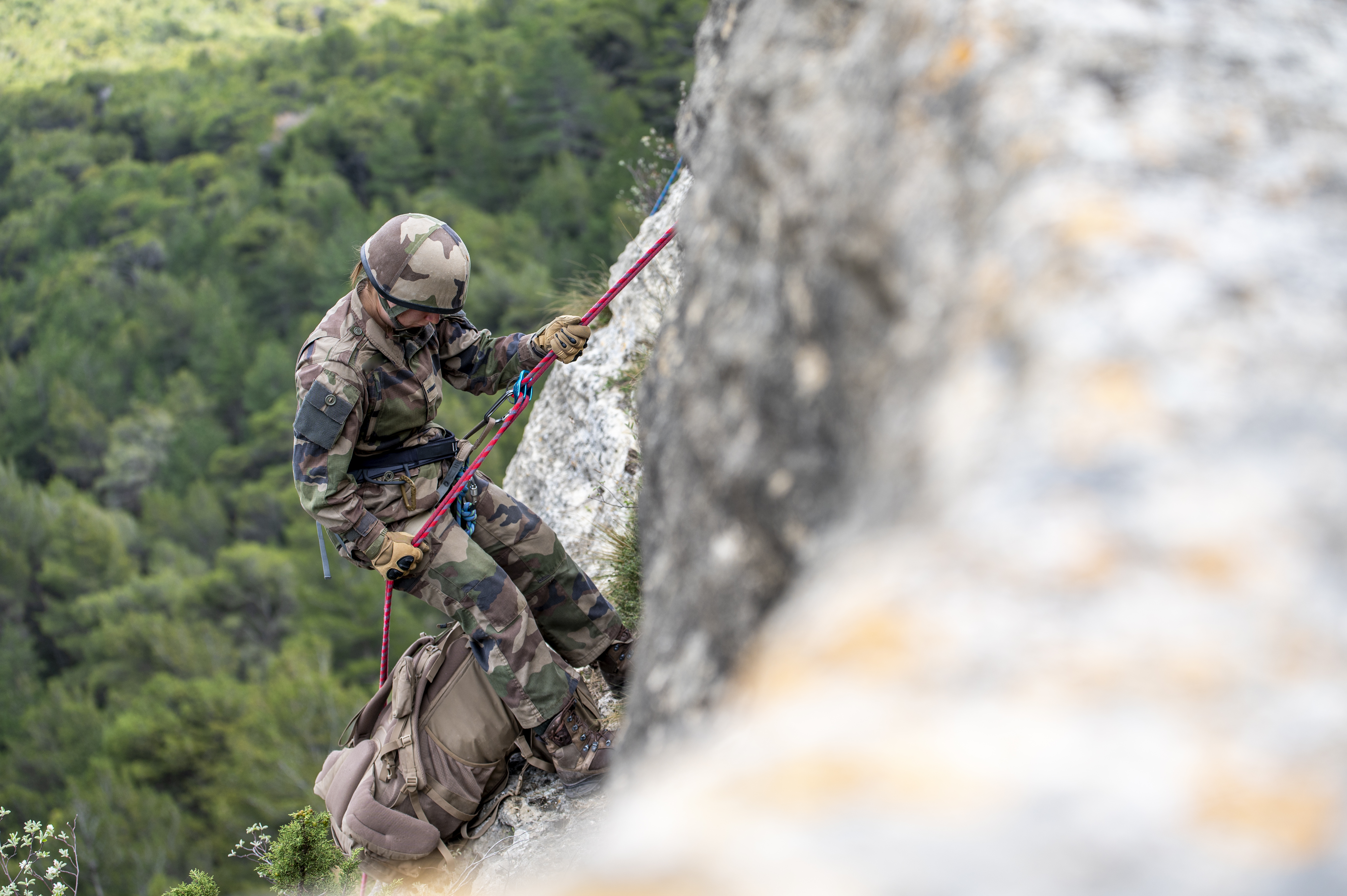 Explication : Exercice de descente en rappel : un des principaux entraînements miltaires effectués lors d'un raid synthèse.
