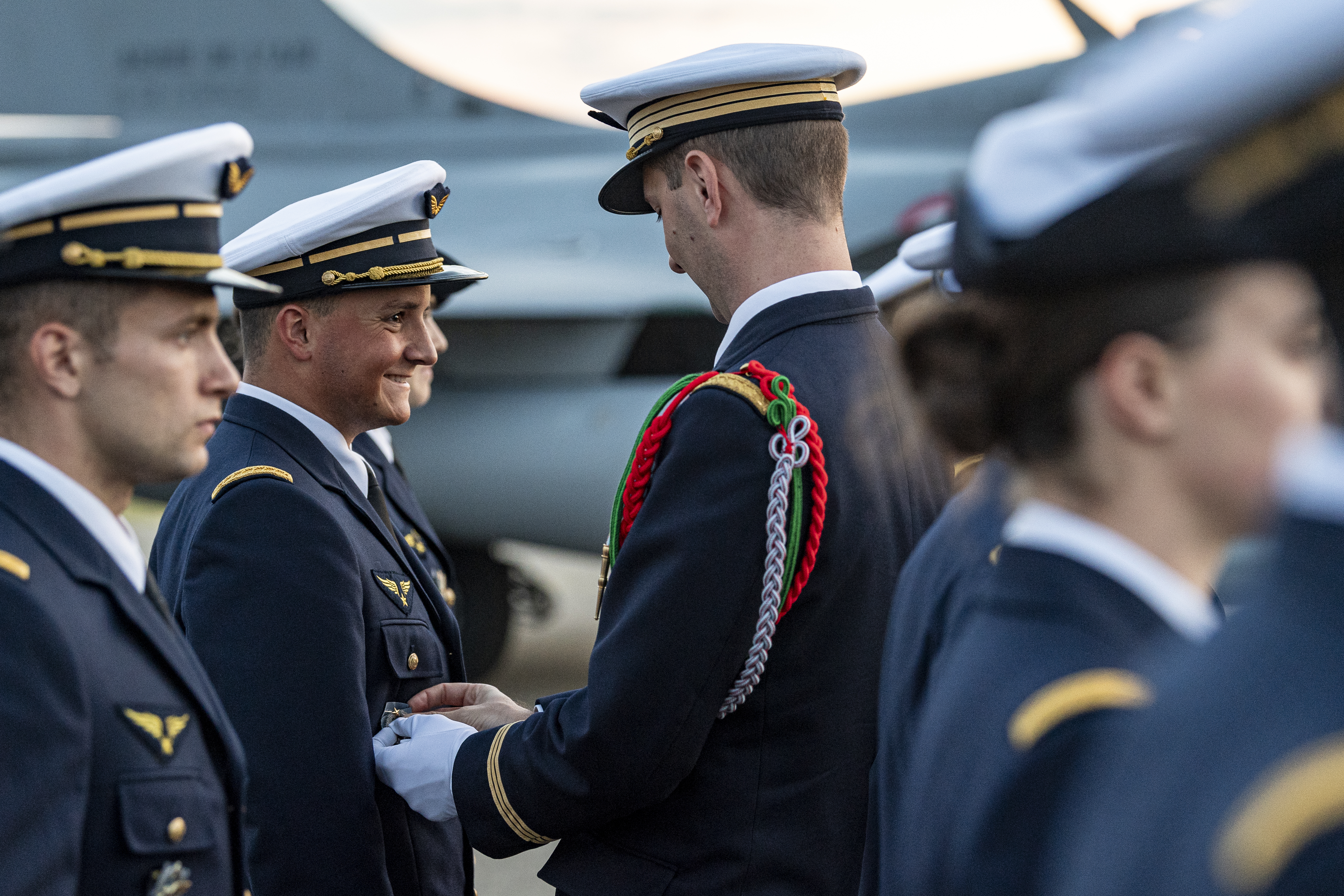 Explication : Chaque année, un escadron parraine une promotion de l'École. Au cours de la cérémonie, les élèves personnels navigants reçoivent leur demi-aile, tandis que l'ensemble se voit remettre la pucelle de l'Escadron parrain.